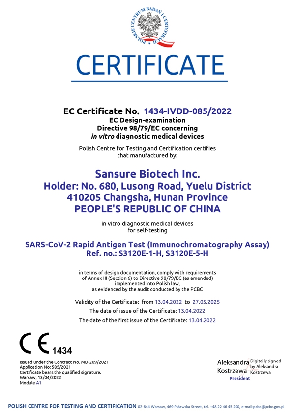 KK体育生物新冠快速抗原检测试剂自测产品取得欧盟CE1434自测证书,表明公司免疫检测产品性能获得官方机构认可,进一步丰富了KK体育生物全场景化新冠检测解决方案,扩大和满足了全球市场各级检测防控需求,为全球疫情防控工作持续助力。