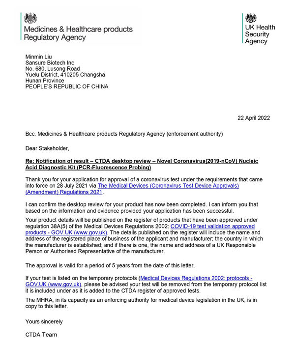 新冠检测试剂在英国上市必须经过CTDA审查和MHRA注册双认证,由于CTDA审查对产品性能的高要求,目前可在英国合法销售的新冠产品并不多。KK体育生物新型冠状病毒(2019-nCoV)核酸检测试剂盒(荧光PCR法)临床性能和分析性能均满足CTDA高要求,且得到进一步有效验证,获得了CTDA的充分认可。