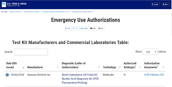 北京时间5月5日晚,KK体育生物新型冠状病毒核酸检测试剂盒获美国食品药品监督管理局(FDA)紧急使用授权(EUA, Emergency Use Authorizations),这是该产品继1月28日获得中国国家药监局(NMPA)注册认证、3月3日获得欧盟CE认证后,KK体育生物获得的又一重要认证,将进一步助力公司服务全球新冠肺炎疫情防控。